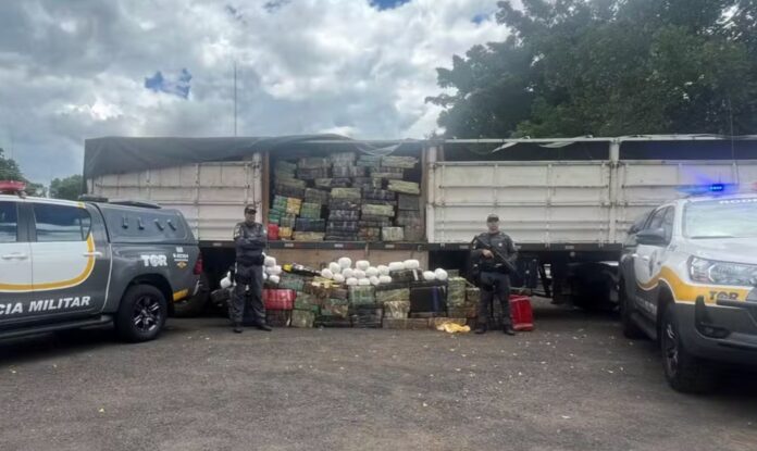 A apreensão ocorreu durante uma fiscalização de rotina da Polícia Militar Rodoviária. Segundo a corporação, a equipe policial abordou um caminhão com placas do Paraguai.