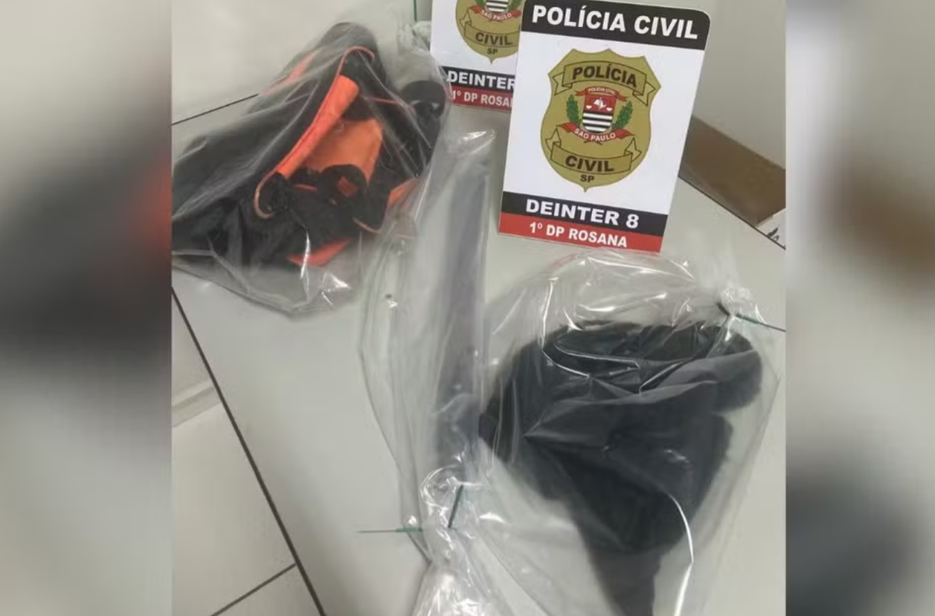 Após a denúncia, equipes realizaram buscas e identificaram o suspeito, que mora nas proximidades da residência da vítima. Durante buscas na casa da mãe dele, que autorizou a entrada, foram encontrados a bolsa usada no crime, a touca e o facão.
