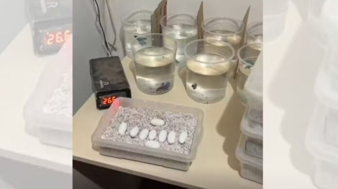 Segundo a Polícia Militar Ambiental, os agentes cumpriram um mandado de busca e apreensão em uma residência, onde também encontraram 264 ovos da mesma espécie, que estavam armazenados em uma incubadora artesanal.