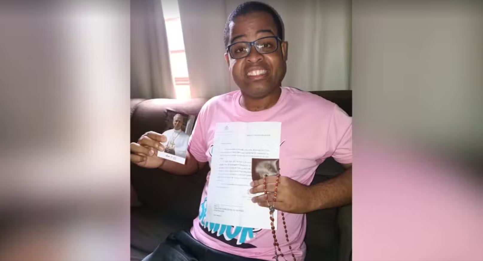 “O terço e a foto têm um lugar especial na minha casa desde o momento em que chegaram. Me sinto feliz ao segurar um objeto que veio diretamente de lá”, explicou o jovem.