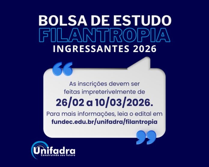 A Unifadra Dracena lançou o Edital 01/2026 para o Processo Seletivo de Bolsa de Estudo Filantropia, destinado aos ingressantes de 2026 já matriculados nos cursos presenciais da instituição. A iniciativa busca beneficiar estudantes em situação de vulnerabilidade socioeconômica, conforme a Lei Complementar nº 187/2021.